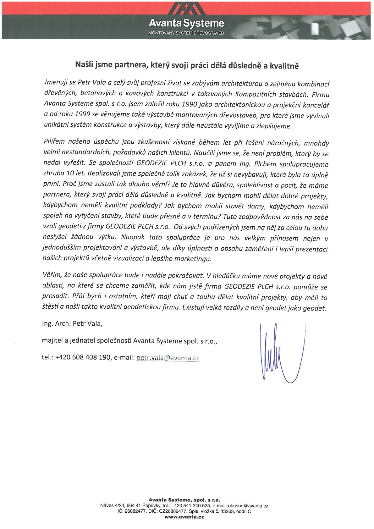 Pilířem našeho úspěchu jsou zkušenosti získané během let při řešení náročných, mnohdy velmi nestandardních, požadavků našich klientů. Naučili jsme se, že není problém, který by se nedal vyřešit. Se společností GEODEZIE PLCH s.r.o. a panem Ing. Plchem spolupracujeme zhruba 10 let. Realizovali jsme společně tolik zakázek, že už si nevybavuji, která byla ta úplně první. Proč jsme zůstali tak dlouho věrní? Je to hlavně důvěra, spolehlivost a pocit, že máme partnera, který svoji práci dělá důsledně a kvalitně. Jak bychom mohli dělat dobré projekty, kdybychom neměli kvalitní podklady? Jak bychom mohli stavět domy, kdybychom neměli spoleh na vytyčení stavby, které bude přesné a v termínu? Tuto zodpovědnost za nás na sebe vzali geodeti z firmy GEODEZIE PLCH s.r.o. Od svých podřízených jsem na něj za celou tu dobu neslyšel žádnou výtku. Naopak tato spolupráce je pro nás velkým přínosem nejen v jednodušším projektování a výstavbě, ale díky úplnosti a obsahu zaměření i lepší prezentaci našich projektů včetně vizualizací a lepšího marketingu.