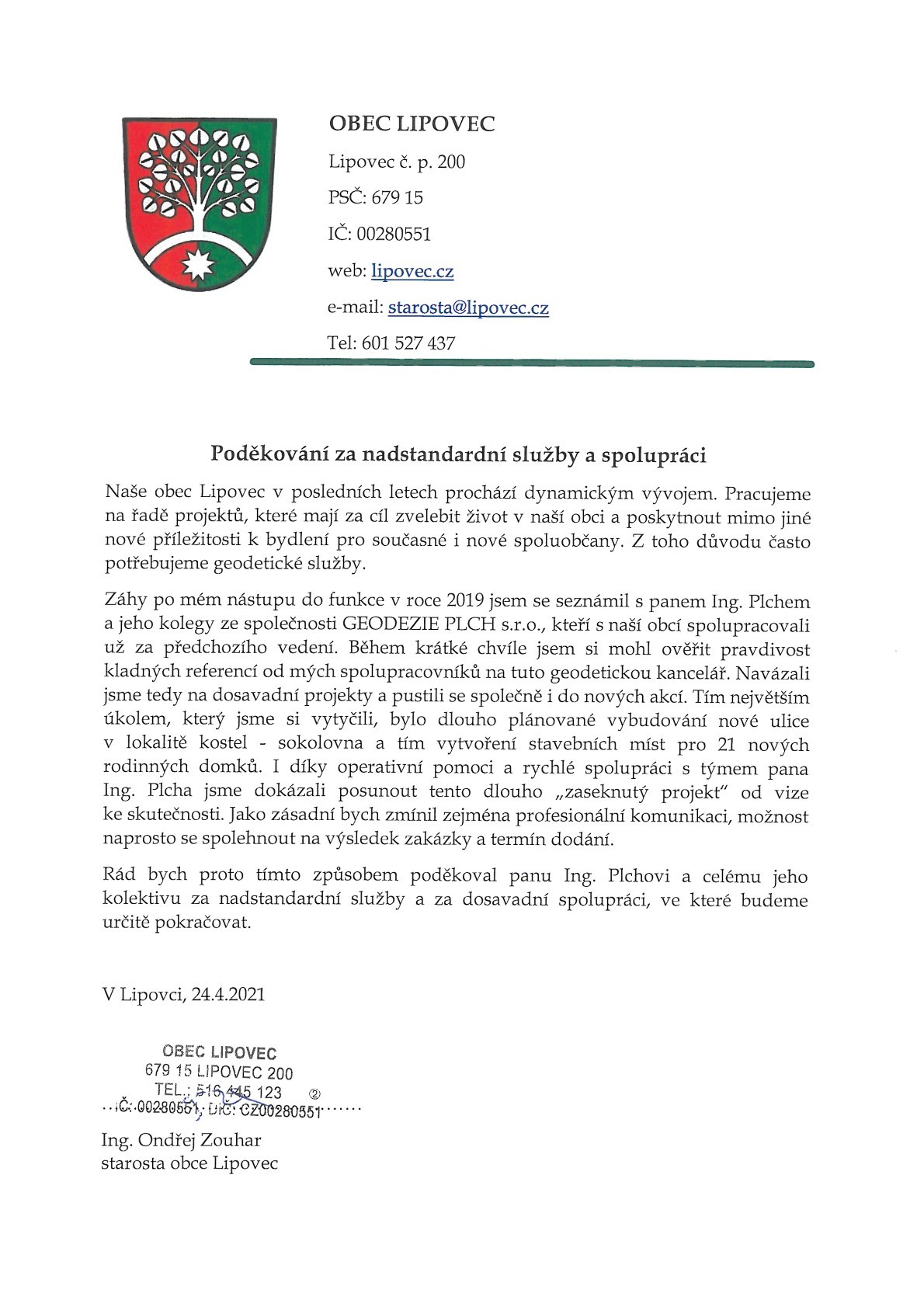 Záhy po mém nástupu do funkce v roce 2019 jsem se seznámil s panem Ing. Plchem a jeho kolegy ze společnosti GEODEZIE PLCH s.r.o., kteří pro naši obec pracovali už za předchozího vedení. Během krátké chvíle jsem si mohl ověřit pravdivost kladných referencí od mých spolupracovníků na tuto geodetickou kancelář. Navázali jsme tedy na dosavadní projekty a pustili se společně i do nových. Tím největším úkolem, který jsem si vytyčil, bylo dlouho plánované vybudování nové ulice v lokalitě za kostelem a vytvoření stavebních míst pro 21 nových rodinných domků. I díky operativní pomoci a rychlé spolupráci pana Ing. Plcha a jeho týmu jsme dokázali posunout tento dlouho zaseknutý projekt od vize ke skutečnosti. Jako zásadní bych zmínil zejména profesionální komunikaci, možnost naprosto se spolehnout na výsledek zakázky a termín dodání.