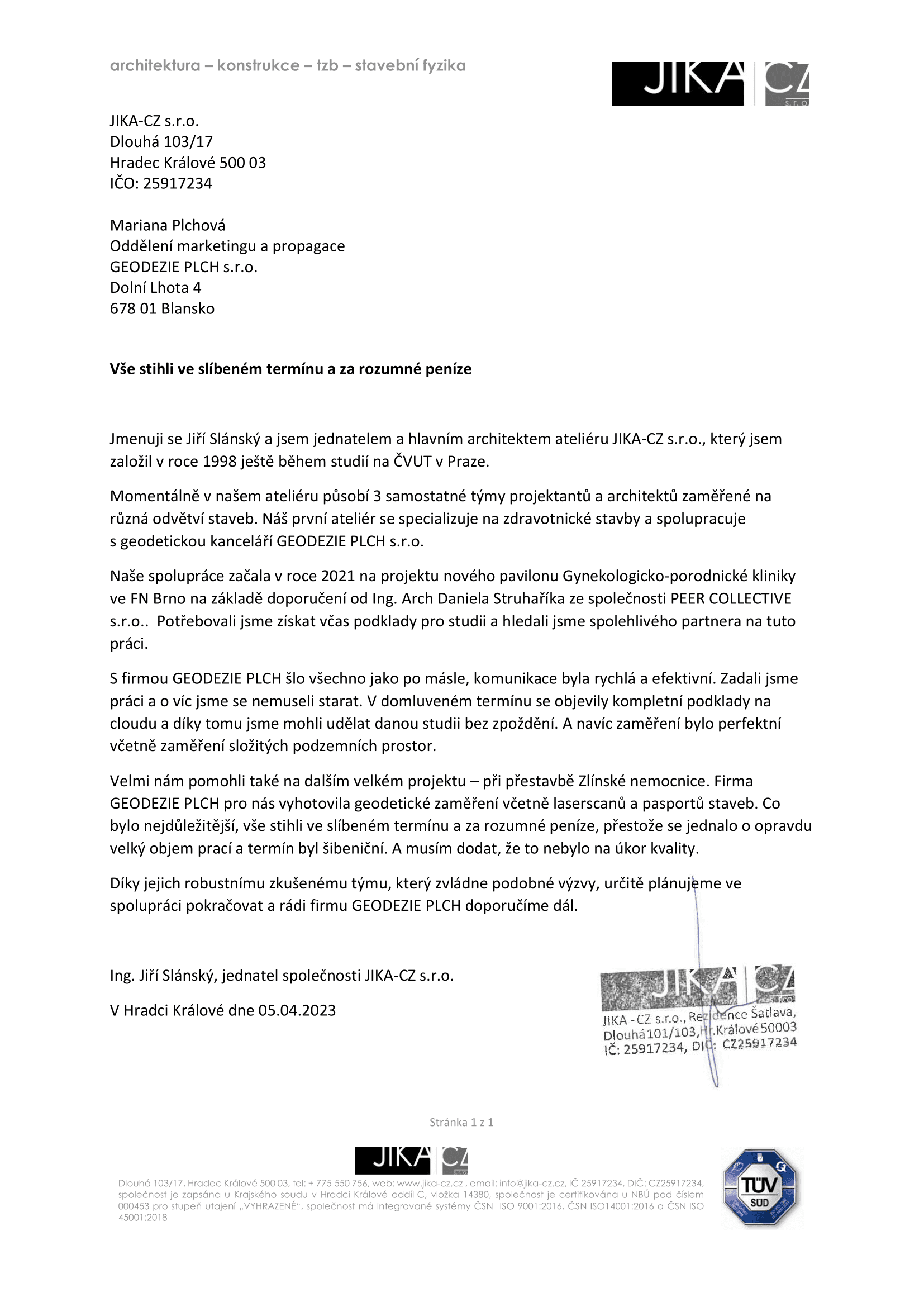 Jmenuji se Jiří Slánský a jsem jednatelem a hlavním architektem ateliéru JIKA-CZ s.r.o., který jsem založil v roce 1998 ještě během studií na ČVUT v Praze. Momentálně v našem ateliéru působí 3 samostatné týmy projektantů a architektů zaměřené na různá odvětví staveb. Náš první ateliér se specializuje na zdravotnické stavby a spolupracuje s geodetickou kanceláří GEODEZIE PLCH s.r.o.